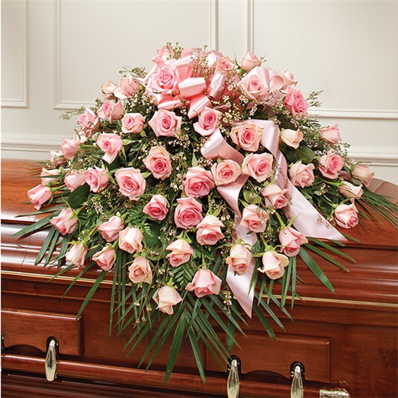 The ultimate symbol of grace, love and admiration, soft pink roses are a sentimental way to honor someone who was deeply cherished. Our half casket cover, crafted with care and artistry by our expert florists with over 50 of these soft-hued blooms and accented with a pink satin ribbon, is an unforgettable way to commemorate a lifetime of unconditional love. •Half casket cover arrangement of pink roses, waxflower and fresh greenery; accented with a pink satin ribbon •Arrangement measures approximately 16"H x 36"L x 28"D •Traditionally sent by the immediate family to the funeral home •Our florists use only the freshest flowers available, so colors and varieties may vary